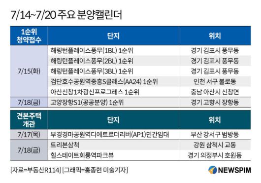 경기 김포시 풍무동 '해링턴플레이스풍무(1·2·3블록)', 경기 고양시 장항동 '고양장항S1(공공분양)', 인천 서구 불로동 '검단호수공원역중흥S클래스(AA24)' 등에서 청약을 진행한다.