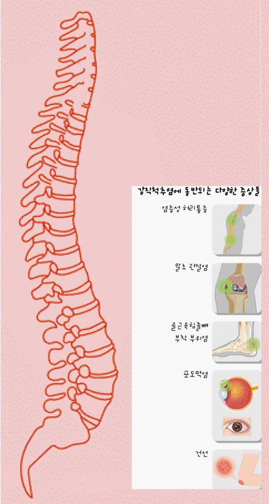 강직척추염은 척추 외에도 전신에서 증상이 나타날 수 있기 때문에 치료를 게을리해선 안 된다. 무릎·발목·발가락 등의 말초 관절염이나 아킬레스건염, 족저근막염 등도 동반되기 쉽다. 힘줄이나 인대가 뼈에 부착되는 부위에 염증이 생기는 것이 강직척추염의 특징이기 때문이다. 척추와 관절 외에도 눈에 포도막염이 생겨 통증과 발적, 시력 저하가 생기거나 크론병, 궤양성 대장염 같은 염증성 장질환이 함께 발생하는 환자들도 있다. 그밖에 대동맥판 기능부전, 심장판막질환 등 심혈관계 합병증과 건선, 골다공증을 포함해 콩팥과 전립선, 폐 등 온몸 이곳저곳에서 다양한 증상이 동반될 수도 있다.