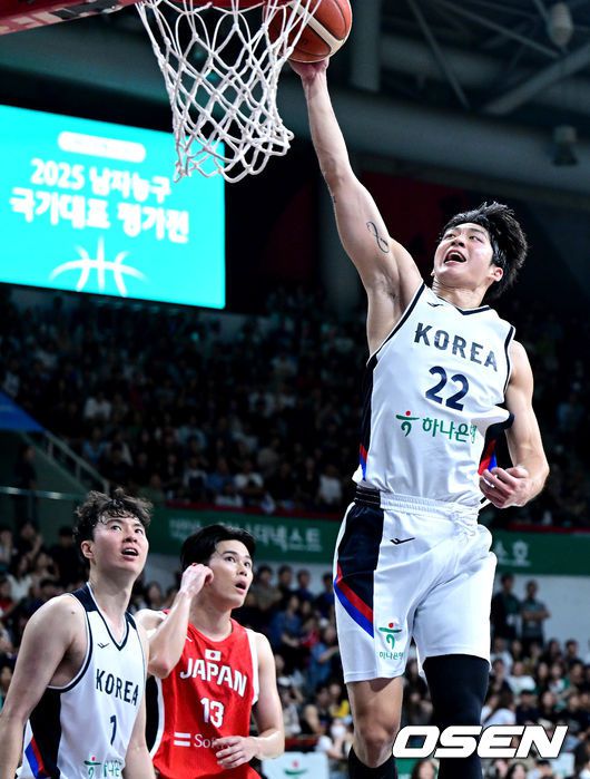 [OSEN=안양, 최규한 기자] 11일 오후 경기도 안양 정관장 아레나에서 ‘2025 남자농구 국가대표 평가전’ 대한민국과 일본의 경기가 열렸다.한국 남자농구 대표팀은 오는 8월 사우디아라비아 제다에서 열리는 '2025 FIBA 아시아컵'을 앞두고 오는 20일까지 일본, 카타르와 평가전을 갖는다.2쿼터, 한국 여준석이 덩크를 시도하고 있다. 2025.07.11 / dreamer@osen.co.kr |