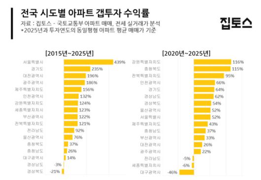 투자금 대비 수익성을 보여주는 '갭투자 수익률'에서는 전혀 다른 결과가 도출됐다. 10년 기준으로는 서울 수익률이 439%로 1위를 지켰지만, 최근 5년으로 기간을 좁히자 강원(116%)과 충북(115%)이 서울(52%)을 제쳤다. 일부 지방 지역의 저가 아파트 상승세가 서울의 상승률을 뛰어넘은 것으로 분석된다.