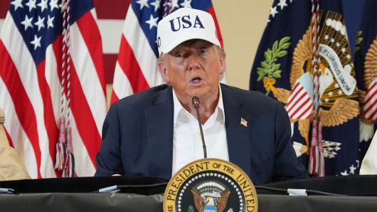 ▲ 텍사스 홍수 피해 현장을 둘러보는 순회 중, 구조대원들과 지역 관계자들과의 간담회에서 발언하고 있다.