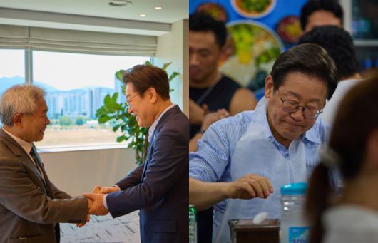 한날 두 식탁. 이재명 대통령이 낮엔 보수 논객들과 식사하고, 밤엔 시민들과 삼겹살과 소맥을 나누며 '국민통합'과 '민생소통'을 동시에 꾀했다.