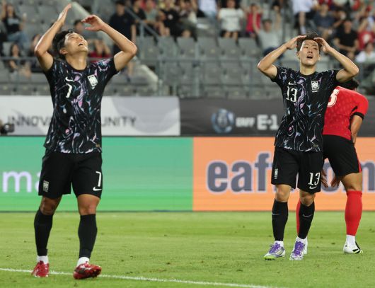 11일 용인미르스타디움에서 열린 홍콩과 경기에서 슈팅이 골문을 벗어나자 아쉬워하는 강상윤(오른쪽)과 나상호 |