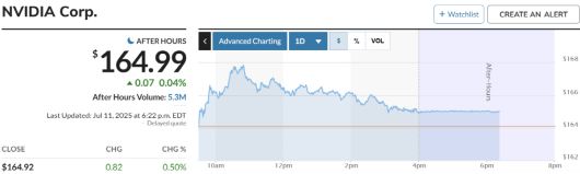 인공지능(AI) 칩 제조업체 엔비디아 주가는 나흘 연속 상승했다. 엔비디아 주가는 전장 대비 0.50% 오른 164.92달러에 장을 마감했다. 시가총액은 4조220억 달러를 기록했다. 엔비디아 주가는 장중 한때 167.89달러까지 고점을 높이기도 했다.