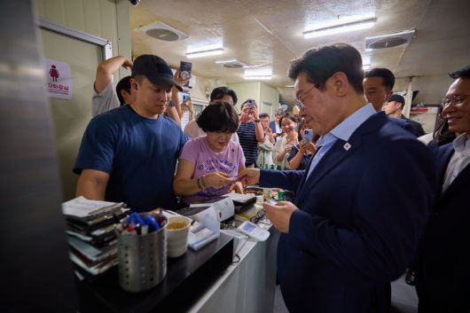[서울=뉴시스] 이재명 대통령이 11일 서울 종로구 한 식당에서 시민들과 '삼겹살 외식'을 마치고 계산을 하고 있다.