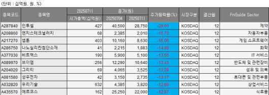 이외에 엔지스테크널러지(-15.72%), 넵튠(-15.06%), 비트맥스(-13.56%), 브이엠(-13.43%), 그리티(-13.28%), 성우전자(-13.17%), 우리기술(-12.88%), 에르코스(-12.87%) 등이 하락했다.