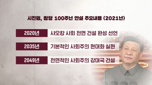이른바 '샤오캉 사회 전면 건설' 이것이 2020년에 이미 이루어졌다라고 주장한 데 이어서 오는 2035년까지는 기본적인 사회주의 현대화를 실현하겠다라고 약속을 했고요. 또 오는 2049년까지는 그러니까 이게 중국 건국 100주년인데 이때까지는 '전면적인 사회주의 강대국 건설을 하겠다' 이렇게 약속을 합니다. 이러한 중국 특색 사회주의 발전 노선이라는 것을 대내외에 공표를 하게 되는데요.