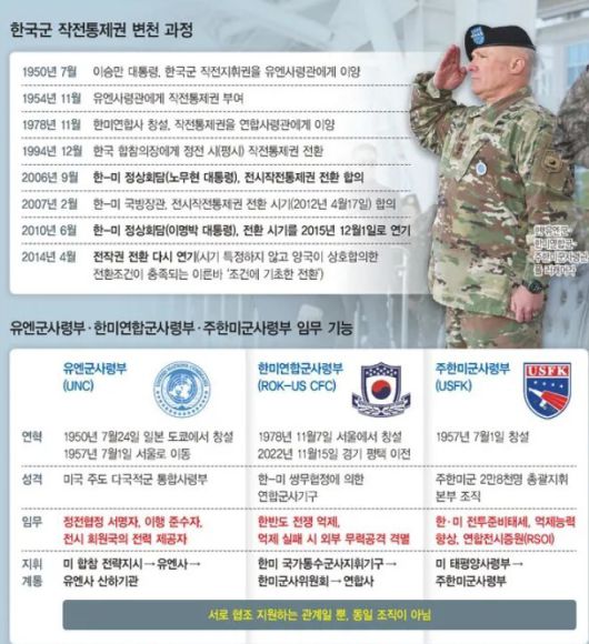 노태우 정부는 정권 초기인 1988년부터 전시, 평시의 구분없이 작전통제권 전체를 환수하려고 했다. 북핵 문제 등이 불거지자 1992년 10월 작전통제권을 평시와 전시로 나눠 일단 평시작전통제권만 먼저 환수하고 전작권은 나중에 환수하기로 미국과 합의했다. 이 합의에 따라 김영삼 정부 때인 1994년 12월 평시작전통제권이 환수됐다. 이후 30년 넘게 역대 한국 정부는 미국과 협의를 하며 전작권 환수를 추진하고 있다. 대통령실이 전작권 전환에 대해 아무 관심이 없었던 윤석열 정부 때도 합동참모본부에는 현역 장군(소장급)이 단장을 맡은 전작권전환추진단이 꾸려져 활동했다.