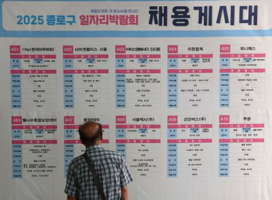 서울 종각역 태양의 정원에서 열린 종로구 일자리 박람회를 찾은 한 구직자가 채용게시대를 살펴보고 있다./연합 |