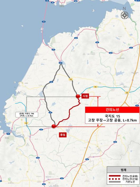12일 군에 따르면 최근 국토교통부의 일반국도, 국지도 승격·지정 고시에 ‘고창군 무장~공음간 지방도 796호선(8.7㎞)’이 전북에서 유일하게 포함됐다.