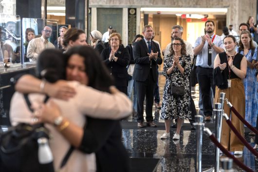 국무부 소속 공무원과 외교관에 대한 해고 통보가 이뤄진 지난 11일(현지시간) 국무부 직원들이 국무부 본부가 있는 워싱턴 해리 S. 트루먼 빌딩 로비에서 국무부를 떠나는 동료에게 격려와 위로의 박수를 보내고 있다. AP연합뉴스 |