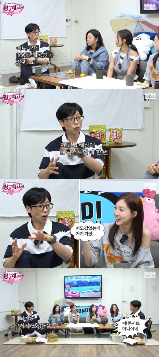 이에 유재석은 "근데 360도의 공연은 저도 예전에 아이유(IU) 콘서트 할 때 한 번 (본 적이 있다)"고 말했는데, 나연은 "저도 갔었는데 거기 가셨어요?"라고 놀라워했다. 유재석도 "나연이 거기 있었어?"라고 놀라워했고, 지석진은 "콘서트 마니아네"라고 거들었다.