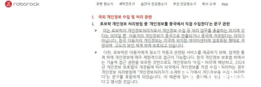 반면, 로보락코리아는 국내 개인정보보호법을 명확히 준수하는 것으로 나타났다. 로보락코리아 개인정보 처리방침 내 '당사가 수집하는 개인정보 및 이용방법'의 I 항목에 따르면, '당사는 개인정보 보호법 제15조 제1항 제4조(계약의 체결 및 이행)을 근거로 이러한 기능을 수행하는 데 필요한 개인정보를 수집 및 이용합니다'라고 명시됐다.