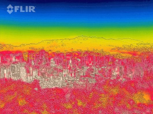 ▲폭염이 계속되는 7월 11일 서울 남산에서 열화상 카메라로 촬영한 시내 모습. 사진 속 높은 온도는 붉은색으로, 낮은 온도는 푸른색으로 표시된다. ⓒ연합뉴스 |