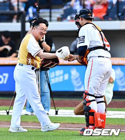 이장우 대전시장이 시구를 마치고 한화 허인서와 인사를 나누고 있다. 2025.07.11 / jpnews@osen.co.kr