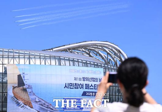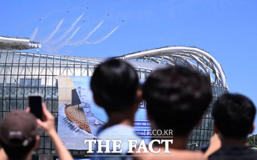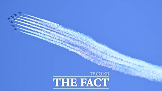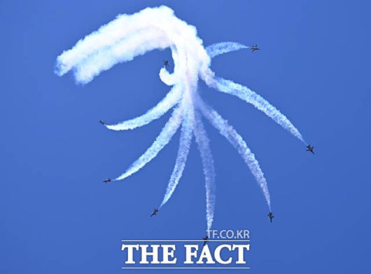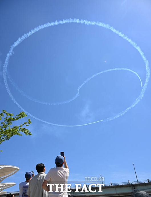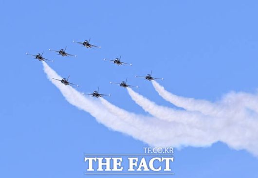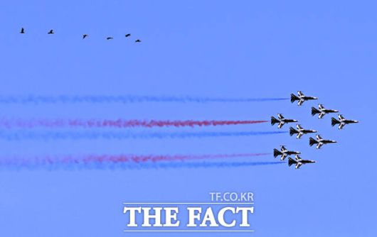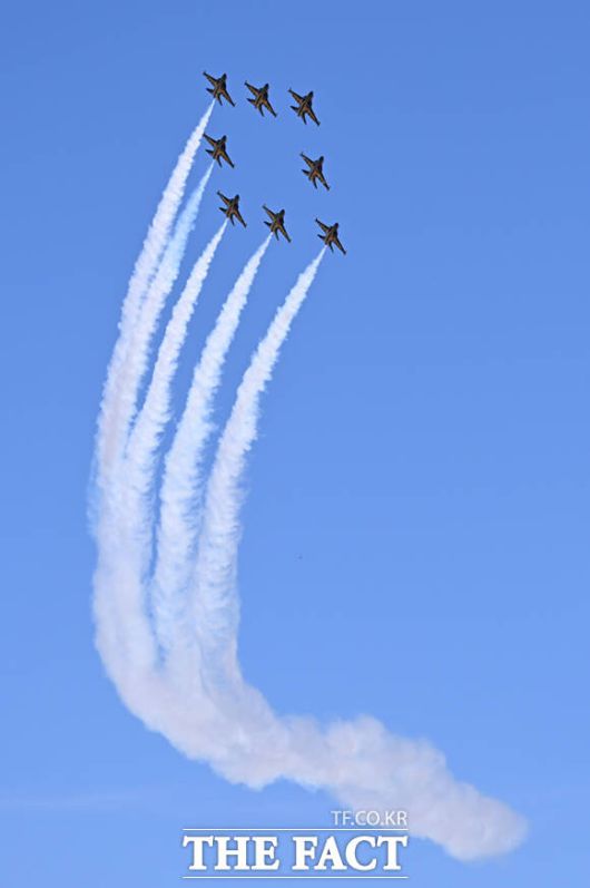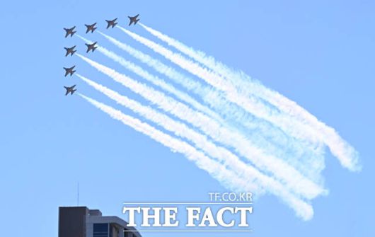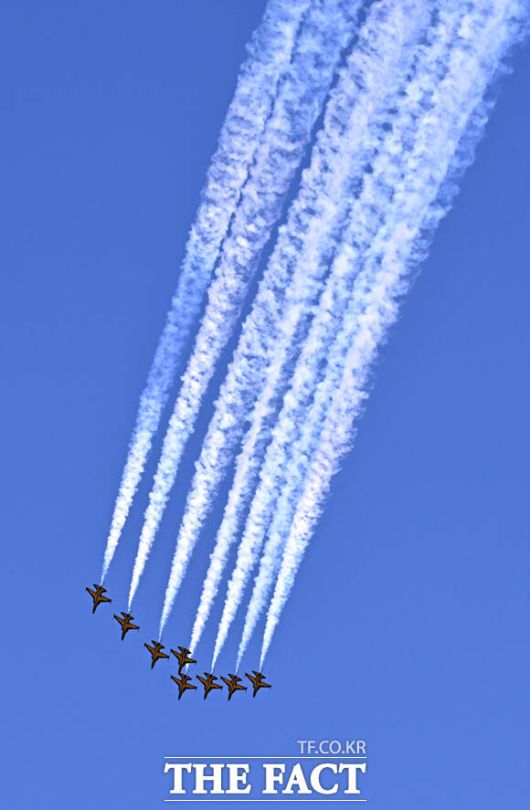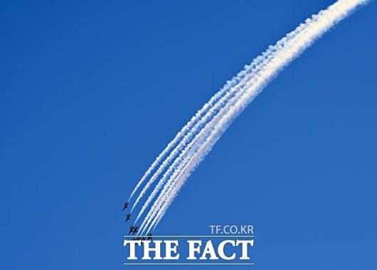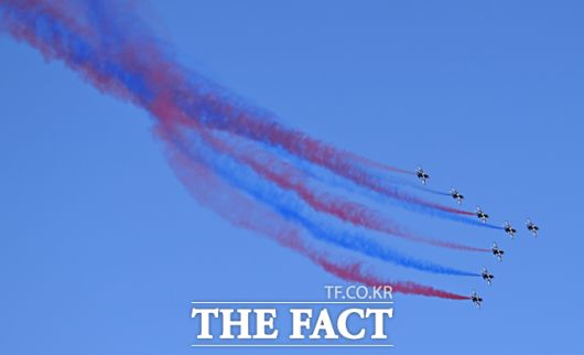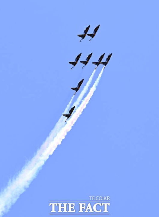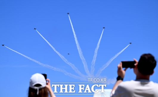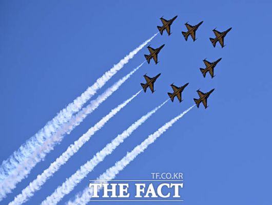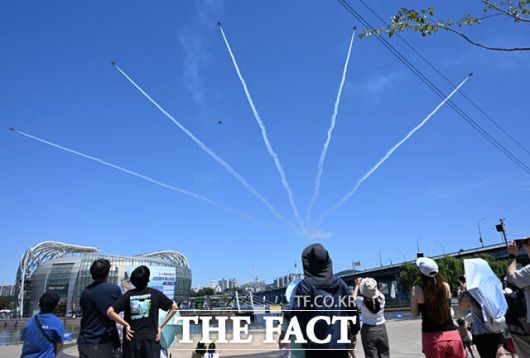 [더팩트ㅣ이새롬 기자] 12일 서울 서초구 반포한강공원 일대에서 제 1회 방위산업의 날 제정(7월 8일)을 기념해 시민 참여 페스티벌 행사가 열린 가운데, 공군 특수비행팀 블랙이글스가 축하 비행을 하고 있다.