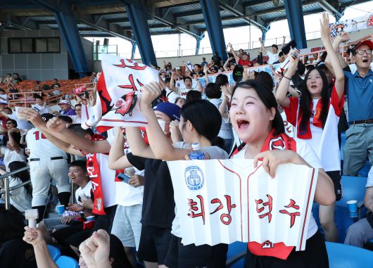 3루 관중석에는 가로·세로 20m 크기의 대형 붉은색 현수막이 펼쳐졌고, 그 위엔 “백년 다진 덕수, 천년 빛낼 덕수, 최강 덕수 우승 GO”라는 문구가 강렬하게 새겨졌다. 동문 300여 명과 재학생 약 80여 명이 자리해 붉은 배경의 머플러를 들어 보이며 “최강 덕수”를 외쳤다. 이봉희 덕수고 후원회장은 “많은 동문이 관심을 가져준 덕분에 응원단을 꾸릴 수 있었다”고 했다.