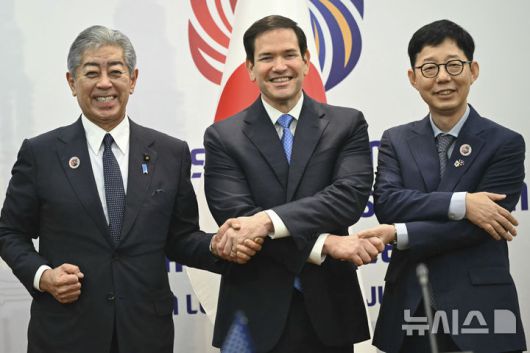 [쿠알라룸푸르=AP/뉴시스] 박윤주(오른쪽) 외교부 1차관이 11일(현지 시간) 말레이시아 쿠알라룸푸르 컨벤션센터에서 동남아국가연합(ASEAN, 아세안) 외교장관회의를 계기로 열린 한미일 외교장관회의에 참석해 이와야 다케시(왼쪽) 일본 외무상, 마코 루비오 미국 국무장관과 기념 촬영을 하고 있다. 2025.07.11.