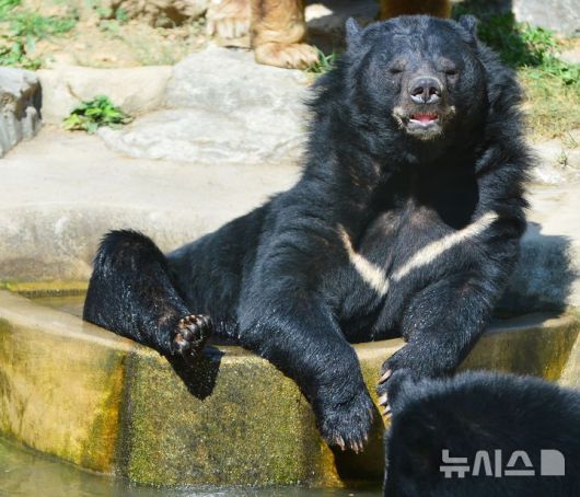 [청주=뉴시스] 서주영 기자 = 12일 오전 충북 청주동물원에서 반달가슴곰이 물 웅덩이에 들어가 더위를 식히고 있다. 2025.07.12. juyeong@newsis.com |