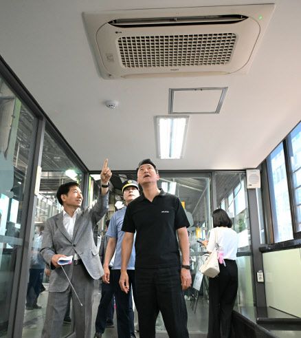 오세훈 서울시장이 12일 오전 비냉방 지상역사인 2호선 건대입구역에 설치된 고객대기실 찾아 에어컨 가동 등을 점검하고 있다. (사진=서울시)