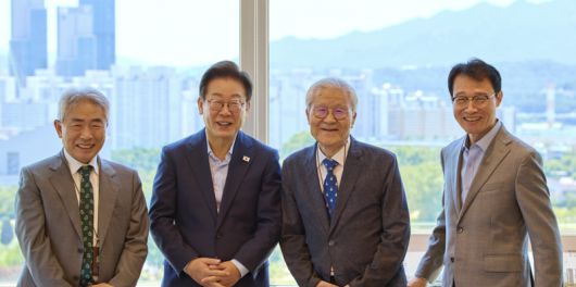 | 이재명 대통령이 11일 서울 용산 대통령실 청사에서 언론인 오찬에 앞서 기념촬영을 하고 있다. (왼쪽부터) 정규재 전 한국경제신문 주필, 이 대통령, 조갑제 '조갑제닷컴' 대표, 이규연 대통령실 홍보소통수석. / 사진=연합뉴스 |