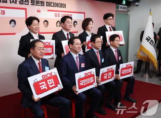 17일 서울 여의도 국민의힘 중앙당사에서 열린 제21대 대통령선거 '1차 경선 토론회 미디어데이'에 참석한 대선 경선 후보들이 기념 촬영하고 있다. 앞줄 왼쪽부터 홍준표 전 대구시장, 유정복 인천시장, 이철우 경북도지사, 김문수 전 고용노동부 장관. 뒷줄 왼쪽부터 양향자 전 의원, 안철수 의원, 나경원 의원, 한동훈 전 대표. 2025.4.17/뉴스1 ⓒ News1 국회사진취재단 |