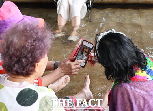 [더팩트ㅣ이새롬 기자] 서울 낮 최고기온이 36도까지 오른 12일 오후 서울 여의도 한강공원 물빛광장을 찾은 어르신들이 물가에서 더위를 식히며 반려견 사진을 보고 있다.