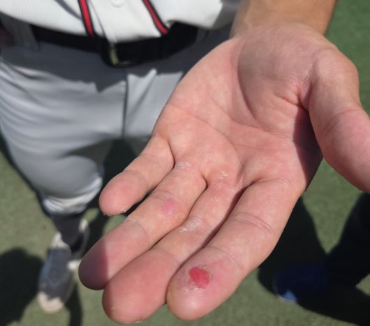 12일 서울 목동구장에서 열린 제80회 청룡기 고교야구선수권 대회 및 주말리그 왕중왕전 부산고와 덕수고의 결승전을 마친 뒤 덕수고 김화중이 다친 왼손을 보여주고 있다. /양승수 기자 |