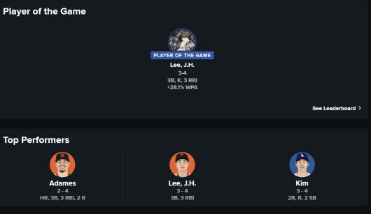 샌프란시스코가 승리하면서 '엠엘비닷컴(MLB.com)'은 경기 최우수선수로 이정후를 선정했다.