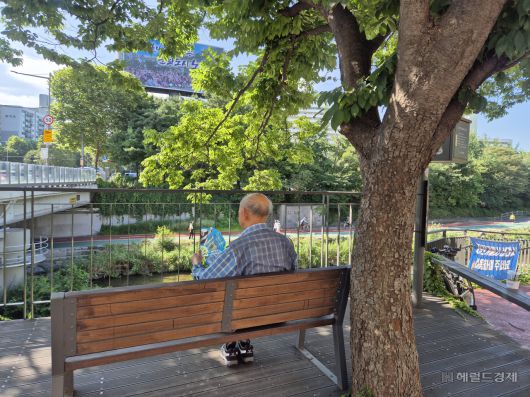 지난 10일 기자가 찾은 서울 노원구 당현천 인근의 한 야외 무더위 쉼터. 계단 위에는 검은색 천막이, 나무 밑 곳곳에는 의자가 설치돼 있었으나 선풍기나 에어컨 등 별다른 냉방장치는 없었다. 한 시민은 그늘진 의자에 앉아 이마 위로 흐르는 땀을 닦으면서 한손으로 연신 부채질을 했다.