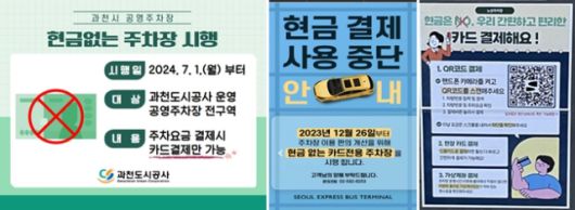 ▲과천도시공사(왼쪽), 서울고속버스터미널(가운데), 공공주차장 등의 현금 결제 사용 중단 조치 관련 포스터. ⓒ김김정현 |