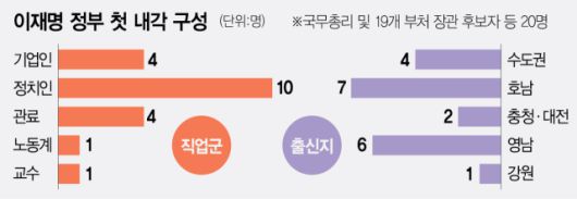 기업인의 약진도 특징으로 꼽힌다. 역대 정부가 학자와 교수 중심으로 내각을 꾸렸던 것과 달리 4명의 기업인이 장관 후보자에 지명됐다. 특히 중소벤처기업부에 이어 문화체육관광부에도 네이버 출신이 장관 후보자에 이름을 올렸다. 하정우 대통령실 인공지능(AI)미래기획수석도 네이버 출신이라는 점에서 내각과 대통령실에 3명이나 네이버 출신이 진출해 눈길을 끌었다.