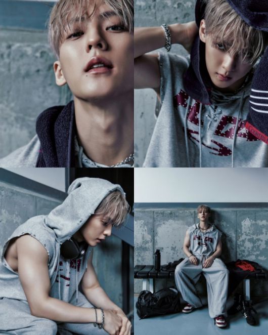첫 번째 포토는 회색 트레이닝복을 입고 벤치에 앉아 땀을 닦는 이민혁의 모습을 담고 있다. 특유의 깊은 눈빛과 민소매 의상을 통해 드러난 탄탄한 팔근육, 생동감 넘치는 포즈가 어우러져 강렬한 아우라를 풍기며 팬심을 제대로 사로잡았다.
