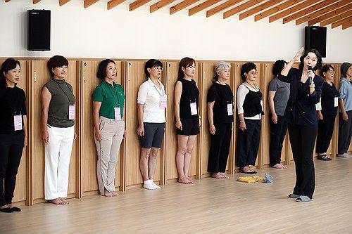 (칠곡=연합뉴스) 김현태 기자 = 지난 8일 경북 칠곡군 향사아트센터에서 열린 칠곡문화재단의 시니어 모델 프로그램 첫 수업. 전문 강사가 참가자들을 교육하고 있다. 2025.7.12