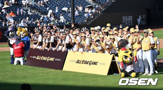 [OSEN=대전, 이대선 기자] 12일 오후 대전 한화생명볼파크에서 2025 신한 SOL뱅크 KBO 올스타전이 열렸다. 13년 만에 대전에서 열리는 KBO 올스타전은 드림 올스타와 나눔올스타 대표로 나선 총 30명의 선수가 치열한 승부를 펼친다. 올스타 선수들이 기념촬영을 하고 있다. 2025.07.12 / sunday@osen.co.kr