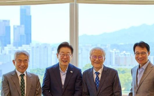 이재명 대통령이 지난 11일 서울 용산 대통령실 청사에서 언론인 오찬에 앞서 기념촬영을 하고 있다. (왼쪽부터)정규재 전 한국경제신문 주필, 이 대통령, 조갑제 '조갑제닷컴' 대표, 이규연 대통령실 홍보소통수석. [사진=연합뉴스] |