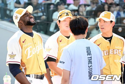 [OSEN=대전, 최규한 기자] 12일 오후 대전 한화생명볼파크에서 ‘2025 신한 SOL Bank KBO리그’ 올스타전이 열렸다. KBO 올스타전 경기는 드림 올스타와 나눔올스타 대표로 나선 총 30명의 선수가 치열한 승부를 펼친다. 경기를 앞두고 한화 플로리얼, 김서현, KIA 성영탁이 대화를 나누고 있다. 2025.07.12 / dreamer@osen.co.kr
