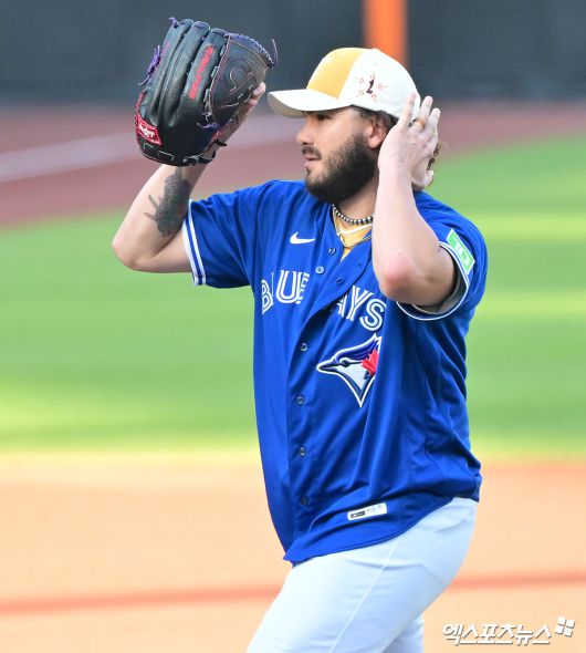 (엑스포츠뉴스 대전, 김한준 기자) 12일 오후 대전한화생명볼파크에서 열린 '2025 신한 SOL Bank KBO 올스타전' 드림 올스타와 나눔 올스타의 경기, 1회초 나눔 올스타 폰세가 류현진의 토론토 유니폽을 입고 있다.김한준 기자 kowel@xportsnews.com