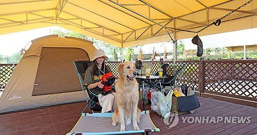 (임실=연합뉴스) 12일 전북 임실군 오수면 오수의견국민여가캠핑장에서 반려인과 반려견이 즐거운 시간을 보내고 있다. 지난 11일부터 본격 운영한 이 캠핑장에 설치된 가로 10m·세로 9m 크기의 22개 데크는 대형 텐트도 설치할 수 있어 가족 단위 방문객과 반려인들이 편하게 휴식할 수 있다. 2025.7.12 [임실군 제공. 재판매 및 DB 금지]
