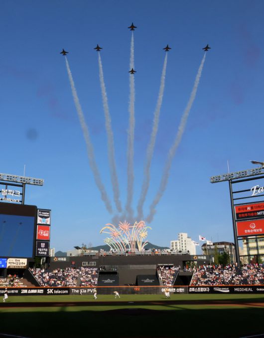 12일 대전 한화생명 볼파크에서 열린 2025 신한 SOL뱅크 KBO 올스타전 시작 전 공군 특수비행 팀 블랙이글스의 에어쇼가 펼쳐지고 있다. 사진=연합뉴스 |