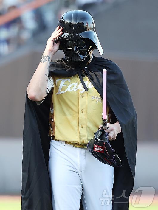 (대전=뉴스1) 김진환 기자 = 12일 대전 한화생명 볼파크에서 열린 ‘2025 신한 SOL뱅크 KBO 올스타전’에서 한화 외국인 투수 폰세가 영화 스타워즈의 캐릭터 다스베이더 복장으로 나오고 있다. 2025.7.12/뉴스1kwangshinQQ@news1.krCopyright ⓒ 뉴스1. All rights reserved. 무단 전재 및 재배포, AI학습 이용 금지.