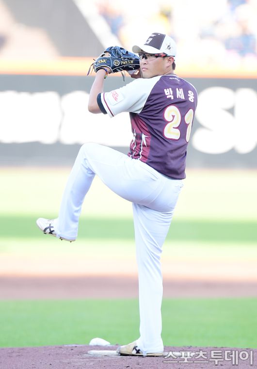 이날 박세웅은 29개의 공을 던지면서 직구 28개 슬라이더 1개를 구사했다. 직구 최고 구속은 146km, 평균 구속은 141km가 나왔다.