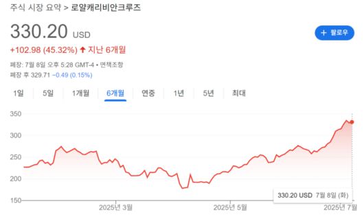 이 같은 강세에 번스타인은 “크루즈는 고품질 복리 성장주로 진화”했다는 평가와 함께 로열캐리비안의 목표가를 $290에서 $360 상향했습니다.
