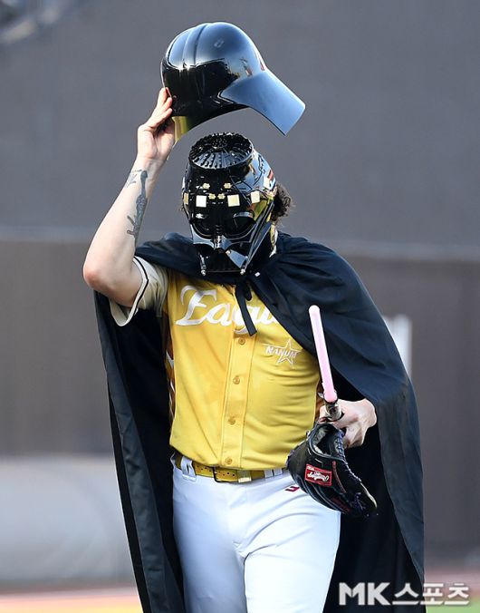 드림 올스타(삼성 라이온즈, 두산 베어스, KT위즈, SSG랜더스, 롯데 자이언츠)를 상대한 폰세는 등장부터 화려한 퍼포먼스를 선보였다. 영화 ‘스타워즈’의 ‘다스베이더’ 복장을 하고 마운드에 오른 것. 끝이 아니었다. 팀 동료 류현진의 토론토 블루제이스 유니폼을 입고 연습투구를 했다. 폰세는 스타워즈와 류현진의 ‘찐팬’이다.