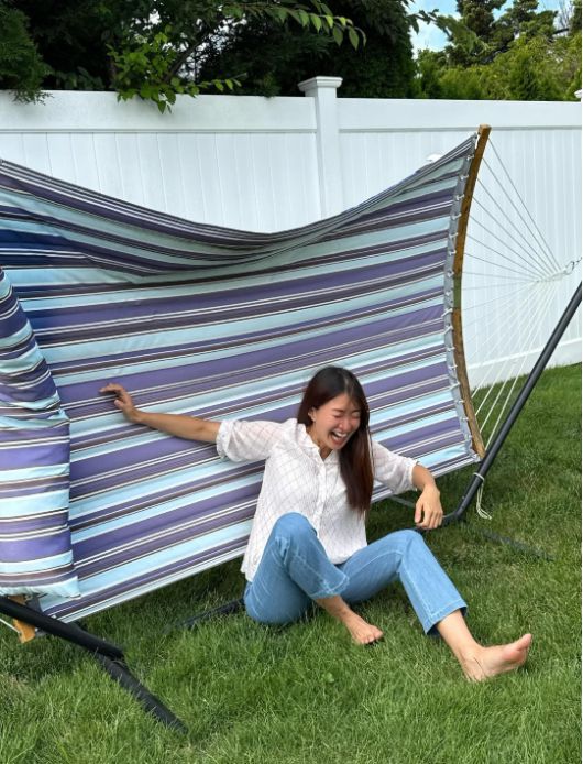 이후 장면은 해먹에 몸을 맡긴 모습이다. 이시영은 소리내 웃고 있었고, 풀밭 위에 앉은 자세는 아이를 기다리는 사람의 자세였다. 햇살은 강하지 않았고, 감정은 단단했다.