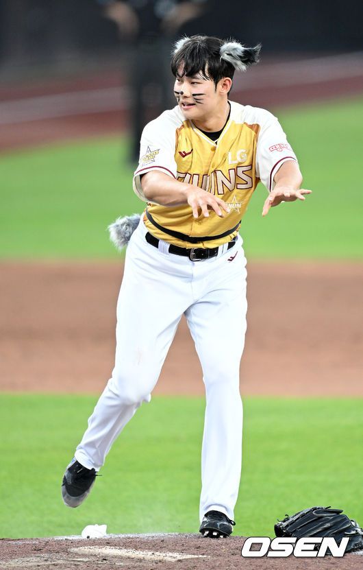[OSEN=대전, 이대선 기자] 12일 오후 대전 한화생명볼파크에서 2025 신한 SOL뱅크 KBO 올스타전이 열렸다. 13년 만에 대전에서 열리는 KBO 올스타전은 드림 올스타와 나눔올스타 대표로 나선 총 30명의 선수가 치열한 승부를 펼친다. 5회초 나눔올스타 김영우가 늑대 분장을 하고 춤을 추고 있다. 2025.07.12 / sunday@osen.co.kr
