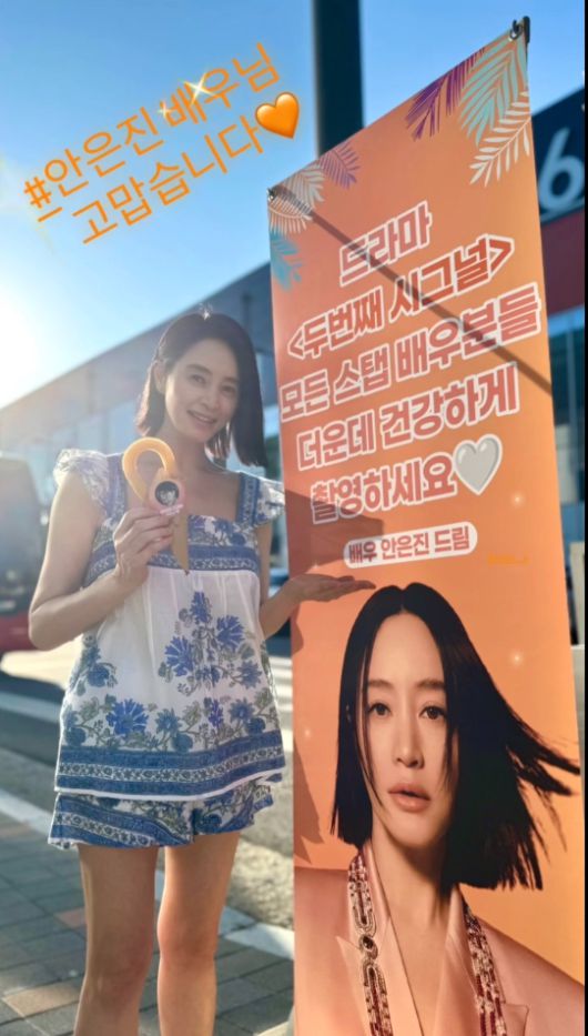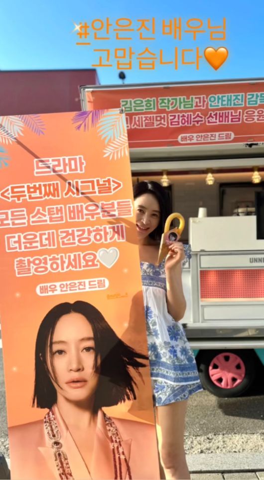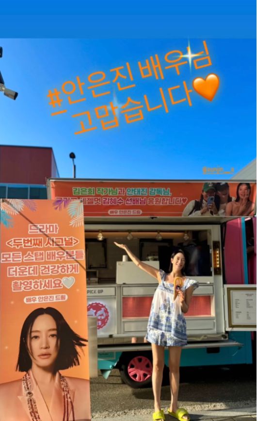 해당 커피차는 ‘시그널2’ 현장에 도착한 것으로, 안은진은 “드라마 <두 번째 시그널> 모든 스태프 배우분들 더운데 건강하게 촬영하세요”라는 메시지를 함께 전했다.