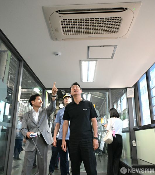 [서울=뉴스핌] 양윤모 기자 = 오세훈 서울시장이 어제 철도시설물 현장점검에 이어 휴일인 12일 오전 비냉방 지상역사인 2호선 건대입구역에 설치된 고객대기실 찾아 에어컨 가동 등을 점검하고 있다. 현재 서울 시내 지하철 비냉방역사는 에어컨 설치가 불가한 지상역 25곳과 개통된 지 오래된 지하역 26곳 등 총 51개소다. 비냉방역사에는 냉방시설을 갖춘 고객대기실과 냉방보조기 등을 운영 중이다. [사진=서울시청] 2025.07.12 yym58@newspim.com