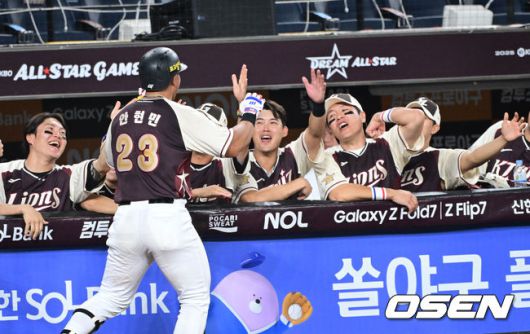 [OSEN=대전, 최규한 기자] 12일 오후 대전 한화생명볼파크에서 ‘2025 신한 SOL Bank KBO리그’ 올스타전이 열렸다. KBO 올스타전 경기는 드림 올스타와 나눔올스타 대표로 나선 총 30명의 선수가 치열한 승부를 펼친다. 8회초 2사 주자없는 상황 드림 올스타 KT 안현민이 추격의 솔로포를 날리고 동료들과 기뻐하고 있다. 2025.07.12 / dreamer@osen.co.kr