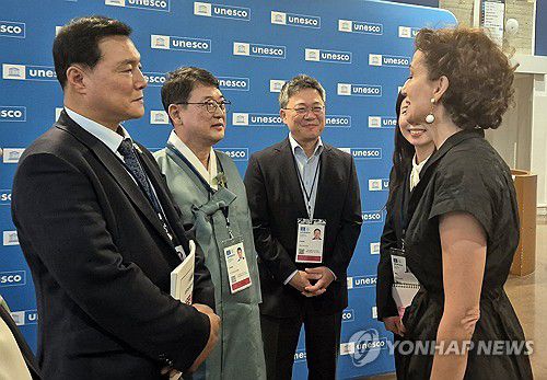 (파리=연합뉴스) 12일(현지시간) 프랑스 파리 유네스코 본부에서 열린 제47차 세계유산위원회에서 '반구천의 암각화'가 등재된 이후 최응천 국가유산청장 등이 오드레 아줄레 유네스코 사무총장과 환담하고 있다. 2025.7.12 [국가유산청 제공, 재판매 및 DB 금지]